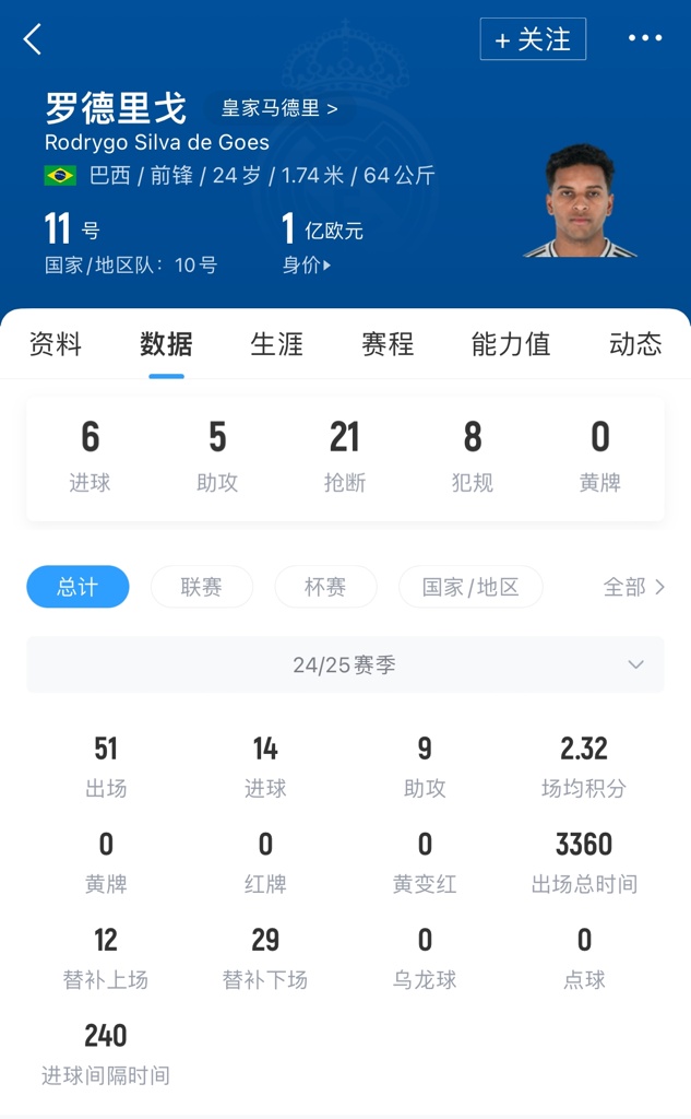 本赛季,罗德里戈为皇马出场51次,取得了14球9助攻的成绩。